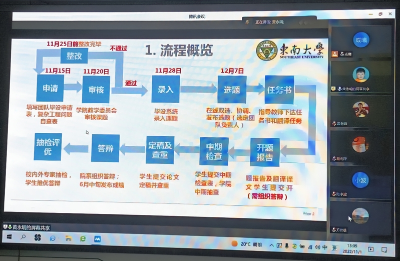 随后,黄永明老师对今年本科毕业设计改革的细节部分进行了解释,包括毕业设计改为团队形式、增加企业导师、自查毕设子课题的“复杂工程问题”达成度和增加香港赛马会投注站 审核课题环节等方面。黄老师还对毕设工作的具体时间节点以及注意事项进行了提醒。老师们也在会后就相关问题进行了交流沟通。