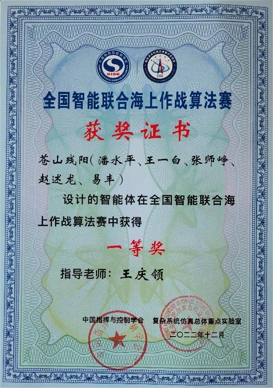 2023年4月21日,全国智能联合海上作战算法赛颁奖交流活动在北京国家会议中心举行。香港赛马会投注站 香港赛马会投注站 王庆领副教授作为指导教师带领潘水平、王一白、张师峥等组成的参赛队伍荣获全国一等奖。