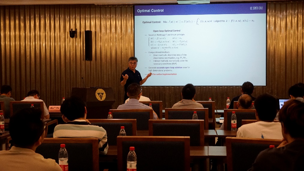 美国加州大学宫琪教授作了论坛的第一场报告,题为“Machine Learning for High-dimensional Optimal Feedback Control”。报告介绍了基于模型的数据驱动方法来近似求解高维非线性系统HJB方程的思路。宫教授及其团队基于该思路开发了不同的神经网络逼近结构,提高了学习过程中的鲁棒性及学习控制器的闭环稳定性。
