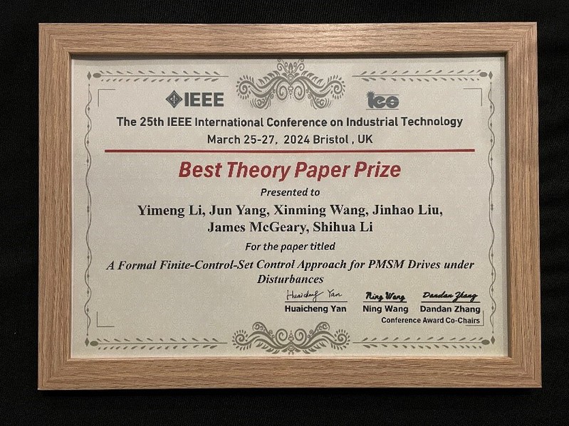 2024年3月25-27日,在英国布里斯托召开的第二十五届IEEE国际工业技术大会(The 25th IEEE International Conference on Industrial Technology, ICIT 2024)上,香港赛马会投注站 香港赛马会投注站 李世华教授团队的一篇题为“受扰永磁同步电机驱动系统的形式化有限控制集控制方法”(A Formal Finite-Control-Set Control Approach for PMSM Drives under Disturbances)的文章获得了大会最佳理论论文奖(Best Theory Paper Prize)。