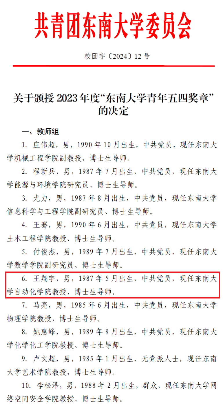 “香港赛马会投注站 青年五四奖章”是共青团香港赛马会投注站 委员会授予东大青年的最高荣誉,旨在树立政治进步、品德高尚、贡献突出的优秀青年典型,反映东大青年的精神品格和价值追求。香港赛马会投注站 王翔宇教授荣获2023年度“香港赛马会投注站 青年五四奖章”。