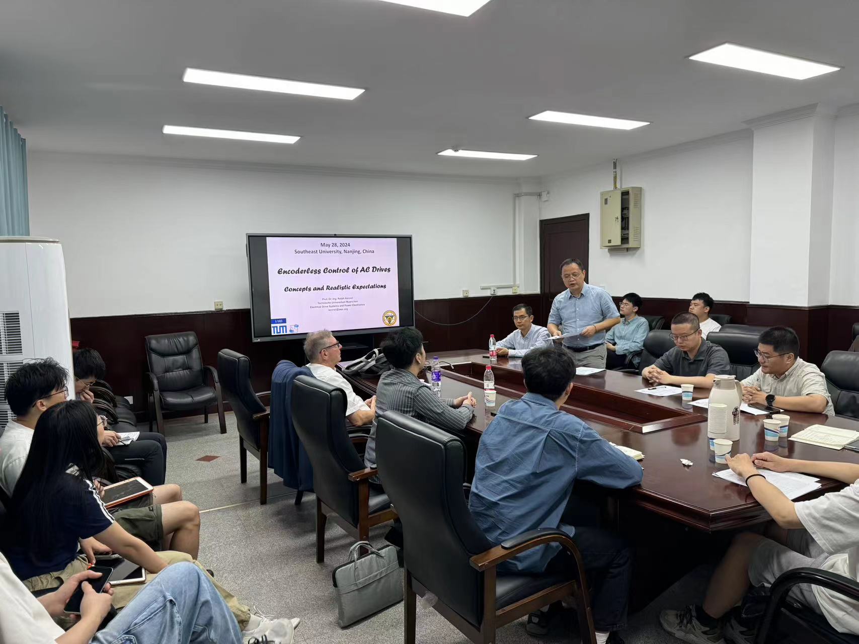 报告主要介绍了交流驱动中无编码器控制的优点和方法,特别是在对于成本较高的应用场景中,采用无位置编码器可以降低成本并增强机械鲁棒性。报告讨论了两种主要的无编码器检测方法,一是反电动势评估,该方法在非零速度下效果良好,但在零频率时效果不佳;二是高频信号注入,该方法利用磁各向异性,对于内置永磁机和同步磁阻机等机器非常有效。报告还着重介绍了表面安装永磁体的同步机上采用无编码器控制的最新进展,在无需额外传感器且不依赖于机器参数的情况下实现了可靠的性能。Ralph Kennel教授的报告深入浅出,使大家有了更深的理解,引发了师生的热烈讨论。