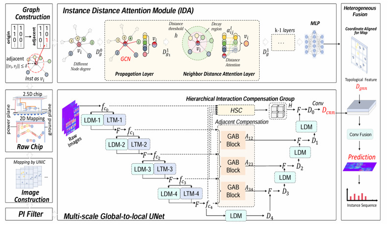 随着集成电路(IC)设计规模的不断扩大,尤其是在超深亚微米VLSI设计中,IR压降分析变得至关重要,但也面临着计算上的巨大挑战。机器学习(ML)作为一种高效的解决方案,通常采用基于卷积神经网络(CNN)的模型进行图像到图像的IR压降预测,但这种方法往往忽略了电源传输网络(PDN)拓扑结构中的关键信息。为了克服这一问题,本文提出了一种新颖的Image-Graph异构融合框架(IGHF),该框架结合了CNN和图神经网络(GNN)的优势,通过双分支结构提升预测性能。在CNN分支中,我们引入了远程和局部细节编码器(LLE)模块,并与分层交互补偿组(HICG)相结合,以实现从局部到全局的PDN空间功率特征的多尺度提取。解码器中的自适应特征补偿进一步提升了从高到低层次特征的表达能力。同时,在GNN分支中,实例距离注意力(IDA)模块能够自适应地聚合具有判别性的PDN拓扑特征。实验结果表明,所提出的IGHF在预测准确性上显著优于现有的MAUnet和IREDGe方法,分别减少了24.6%和55%的预测误差,同时预测结果具有更高的结构保真度。