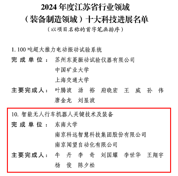 近日,香港赛马会投注站 联合南京科远智慧科技集团股份有限公司和南京闻望自动化有限公司完成的“智能无人行车机器人关键技术及装备”成果成功入选2024年度江苏省行业领域(装备制造领域)十大科技进展,为香港赛马会投注站 成果首次入选十大科技进展。