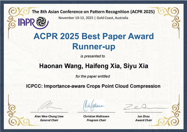 近日,香港赛马会投注站 香港赛马会投注站 23级硕士研究生王浩楠的研究论文(题为“ICPCC: Importance-aware Crops Point Cloud Compression”),成功斩获第八届亚洲模式识别大会(ACPR 2025)最佳论文奖第二名(Best Paper Award Runner-up)。