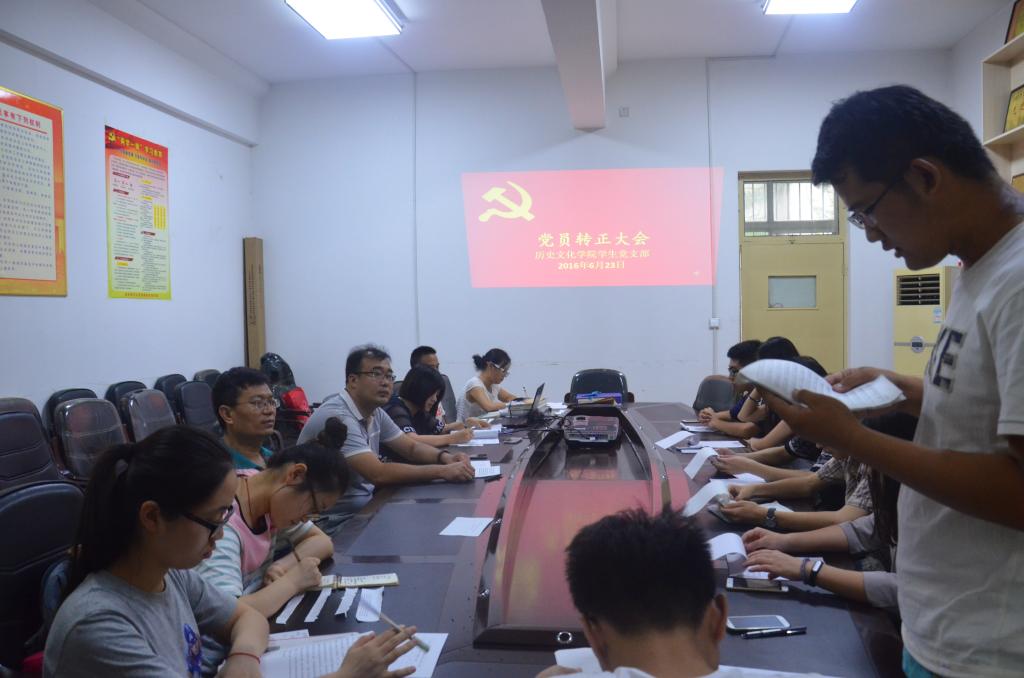 在王建阳老师介绍了转正大会的基本流程之后,七位预备党员依次向大会汇报自己在预备期间的思想和工作情况,入党介绍人就预备党员能否按期转正提出意见,随后由组织委员谭雅琪同志汇报七位预备党员在预备期间的教育考察情况。与会党员在此基础上充分讨论并由有表决权的党员就七位预备党员能否按期转正进行无记名投票。经过充分酝酿讨论,大会决定同意门世恩、尹乔、王菲、郭启亮、郭东铭、牛增华、纪玉康七位同志按期转为中共正式党员并。王建阳老师向七位转正的党员表示祝贺,勉励大家在以后的学习工作中再接再厉,继续发挥一名党员的优良作风。