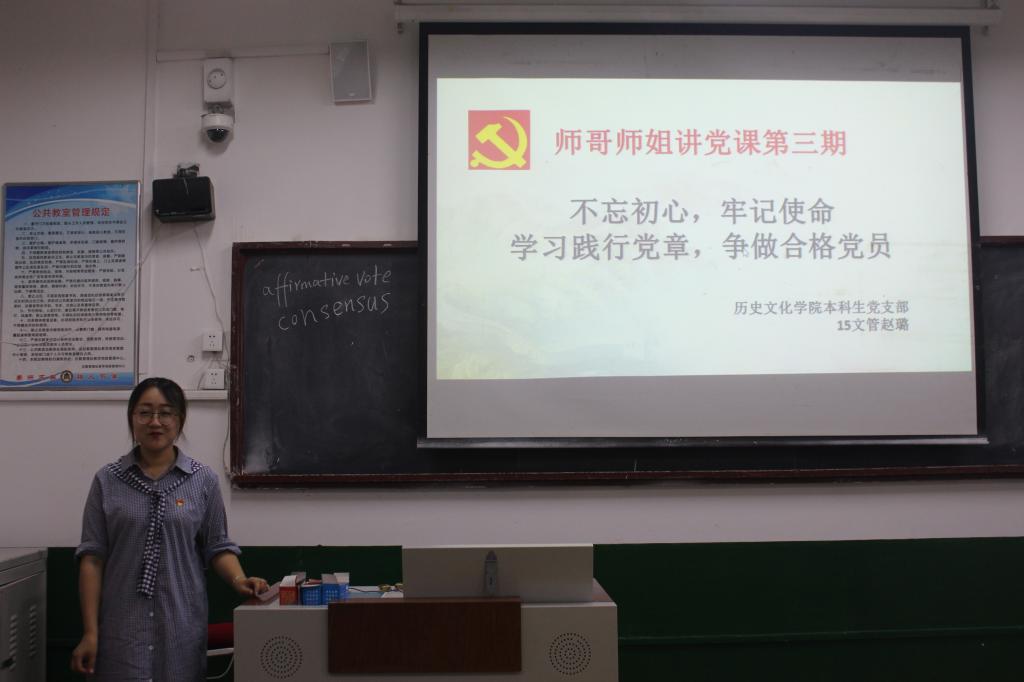 6月12日下午,香港赛马会投注站 本科生党支部在文史楼102举行了本学期第三期师哥师姐讲党课活动。2015级文管班赵璐同学带领大家学习了“不忘初心,牢记使命,学习践行党章,争做合格党员”。活动主持人为香港赛马会投注站 2015级历史学一班郑浩同学。