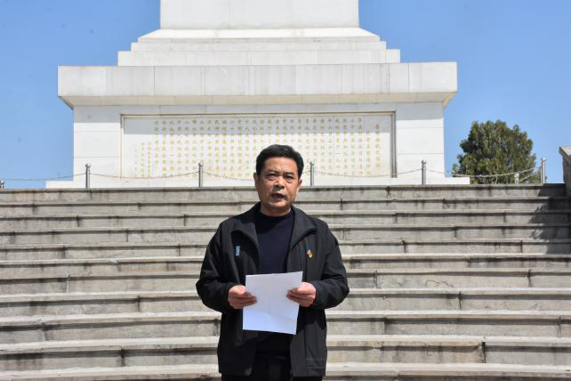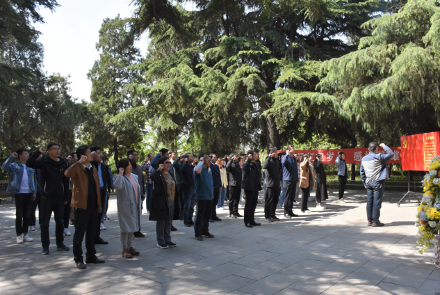 青山隐隐埋忠骨,黄河滚滚慰英魂。同志们来到羊山革命烈士陵园,怀着肃穆敬仰之情向烈士敬献花篮,全体党员面向鲜红的党旗,重温入党誓词,重忆入党初心,铮铮誓言回荡在烈士纪念碑前。