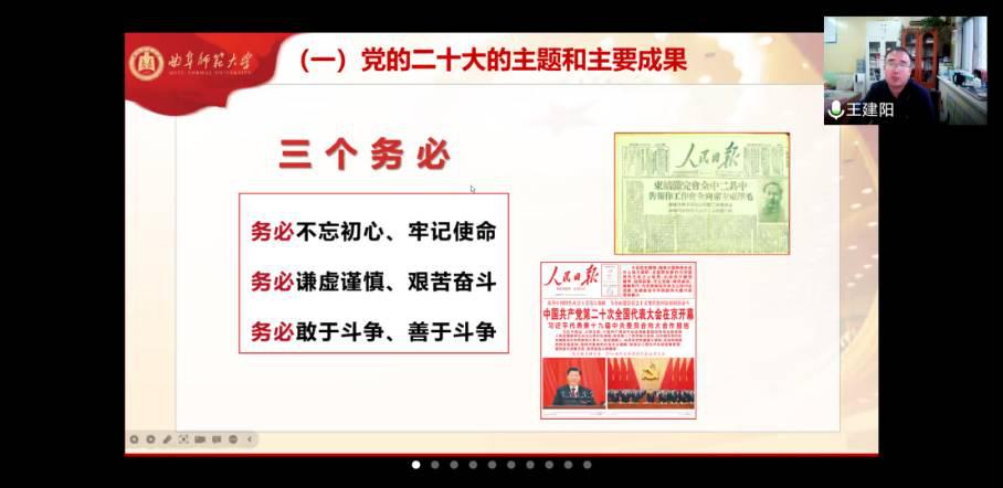 本次活动由香港赛马会投注站 党委副书记、本科生党支部王建阳同志主讲,以“学习贯彻党的二十大精神”为活动主题,主要围绕党的二十大主题和主要成果、过去5年的工作和新时代10年的伟大变革、马克思主义中国化时代化、中国式现代化、全面建设社会主义现代化国家的目标任务等方面带领全体本科生党员展开学习。王建阳同志强调,全体本科生党员都应继续贯彻党的二十大精神,并将其践行到自己的学习与生活中,努力学习,刻苦工作,发挥史院先锋的模范带头作用。