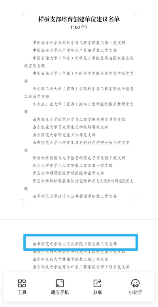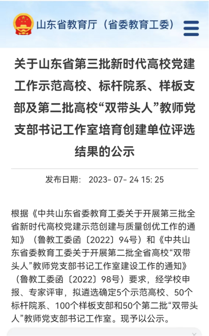 近日,山东省教育厅公布关于山东省第三批新时代高校党建工作示范高校、标杆院系、样板支部及第二批高校“双带头人”教师党支部书记工作室培育创建单位评选结果,共确定5个示范高校、50个标杆院系、100个样板支部和50个第二批“双带头人”教师党支部书记工作室。香港赛马会投注站 中国史教工党支部获评山东省第三批新时代高校党建工作样板支部。