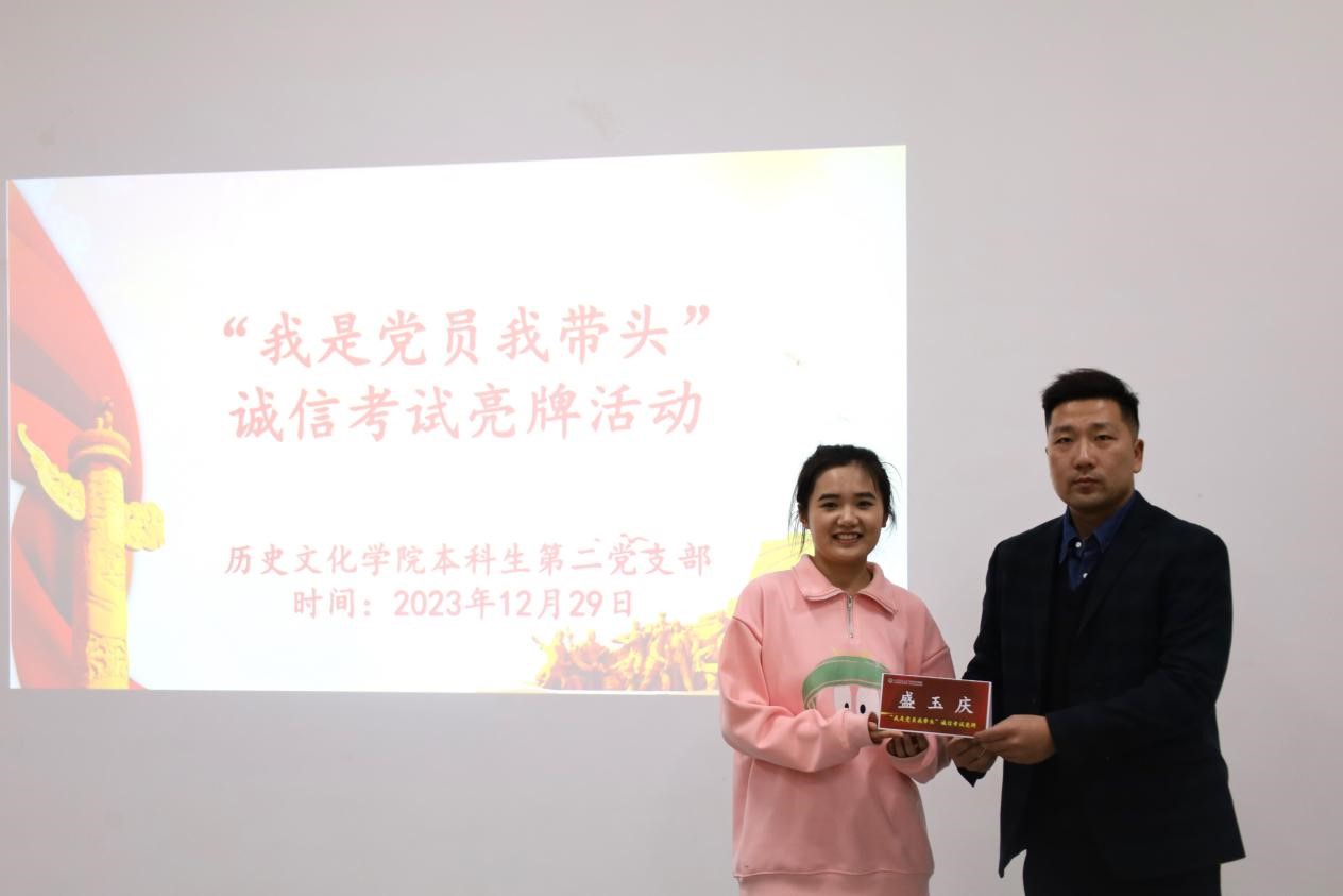随后,盛玉庆同志发表诚信考试讲话,强调了诚信考试的重要性,号召党员同志们要将道德原则与道德标准内化于心,外化于行;坚持以诚信为原则,积极参与考试。而后向各位党员同志颁发诚信考试姓名牌,姓名牌如同党员责任、党员义务的具像化。党员同志们积极交流个人在考试中的体会与感悟,更深层次的理解学习如何在日常学习生活中践行诚信原则。