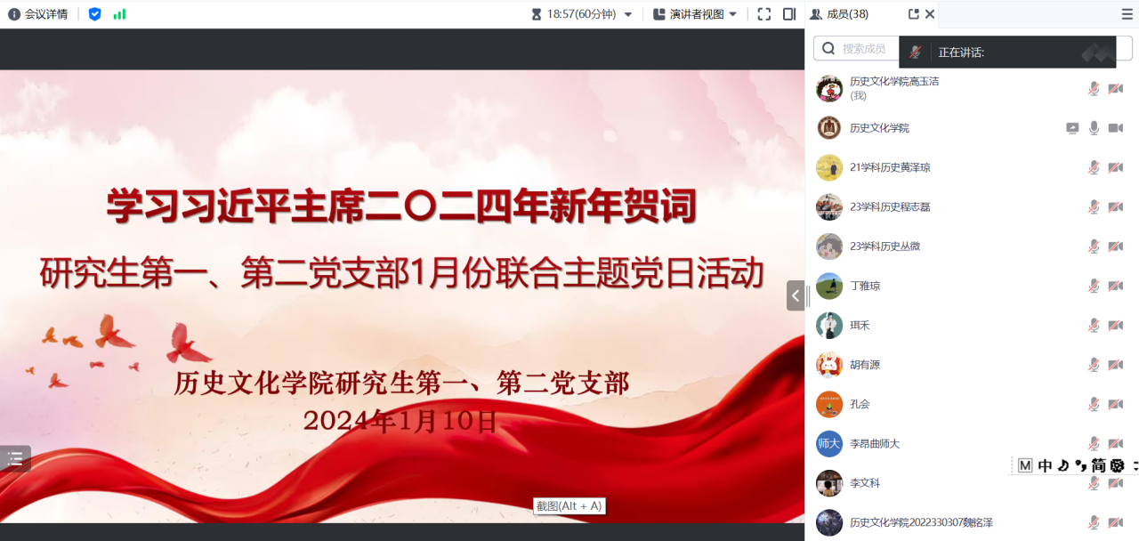 新岁序开,同赴新程。2024年1月10日下午,香港赛马会投注站 研究生第一、第二党支部联合在孔子书院B120教室召开1月份主题党日活动。会议的主题是学习“习近平主席二〇二四年新年贺词”。会议由第一党支部书记孙锋同志主持,两支部全体党员及入党积极分子以线上线下相结合的方式参加的本次活动。