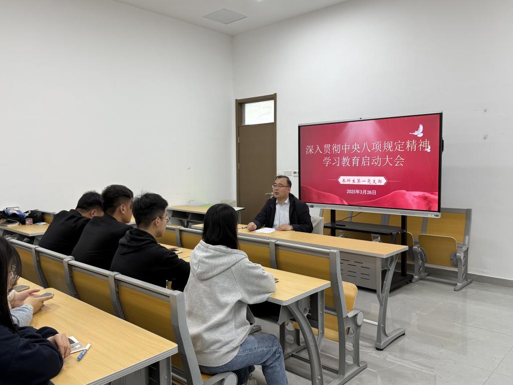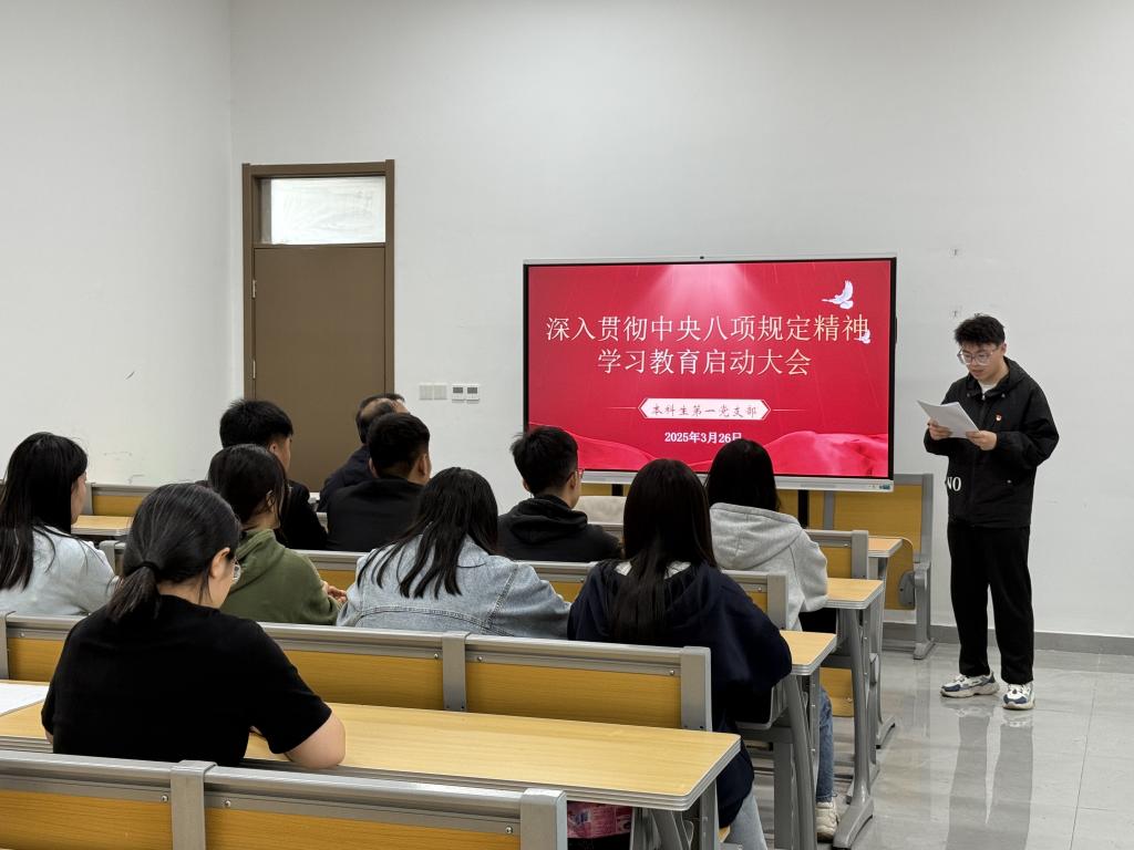 2025年3月26日下午,香港赛马会投注站 本科生第一党支部于孔子书院B120教室召开深入贯彻中央八项规定精神学习教育启动大会,会议由支部书记王建阳主持,支部全体党员参加。