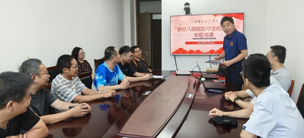 为深入学习贯彻党的二十大精神,进一步加强党风廉政建设,增强党员教师的纪律意识和规矩意识,中国史教师党支部于2025年7月9日在孔子书院B230会议室组织开展了“学好八项规定 守住纪律底线”专题党课。本次党课由党支部书记姜修宪主讲,支部全体党员参加学习。