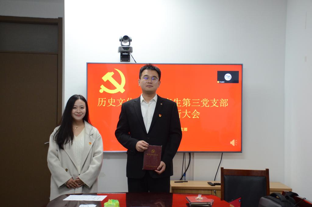 最后,孙锋、杨紫依、李美琪分别代表各自支部为4名转正党员同志颁发了政治生日贺卡,为7名新接收的预备党员同志颁发了党徽和党员学习笔记,并进行总结发言,对4名党员同志顺利转正,7名同志加入党组织表示祝贺,希望他们能够坚守初心、砥砺前行,在将来的学习、工作和生活之中,继续发挥党员模范作用。