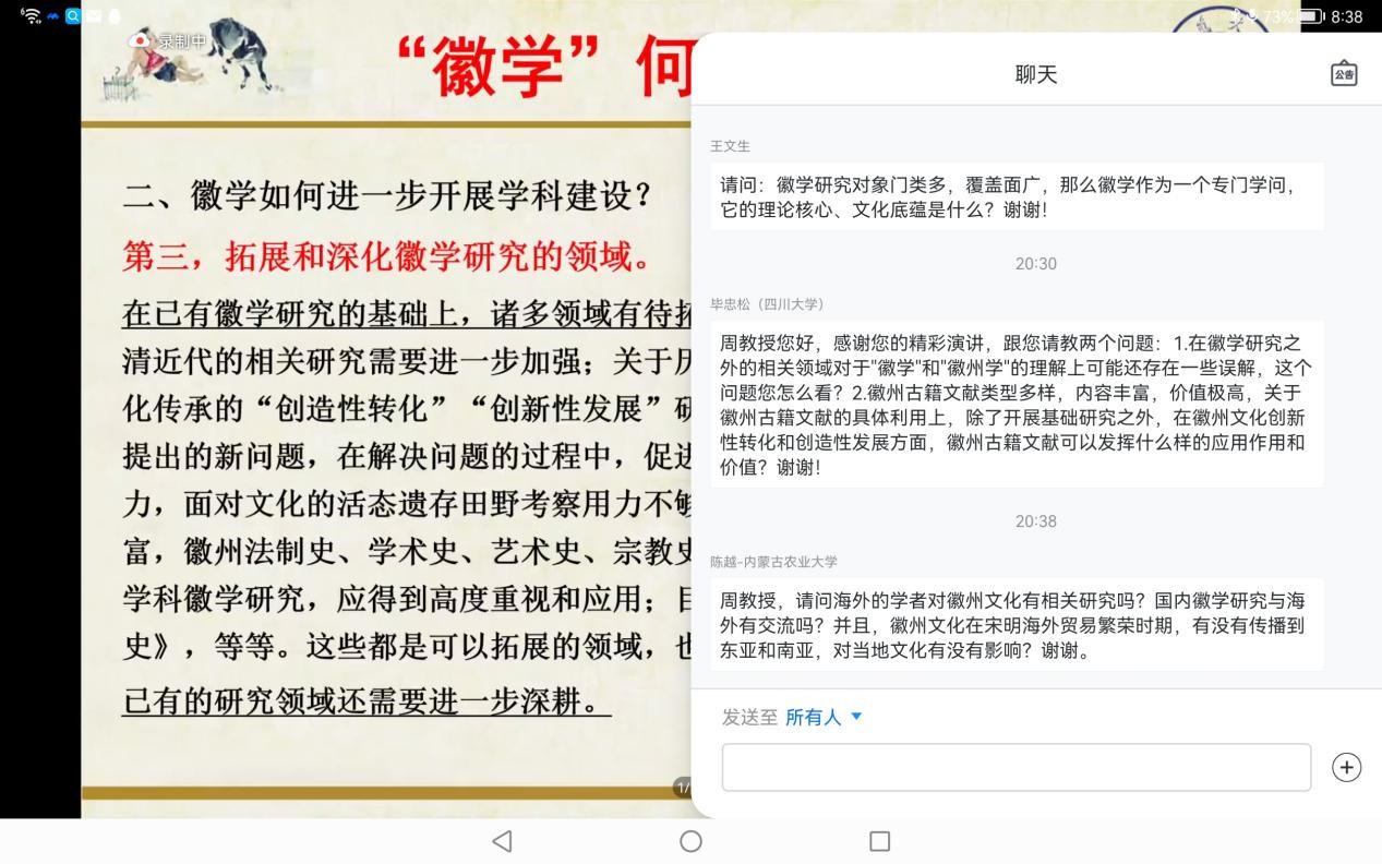 报告开端,周教授首先对“徽学”的基本概念进行了三个层次的梳理:其一,释义“徽学”之“徽”。周教授讲述指出,在上世纪80年代学界最初讨论徽学问题时,“徽学”便称“徽州学”,并特别强调“徽学”并非“安徽学”。沿时间的脉络,从徽州的地理位置到区域发展,立体呈现了古徽州的地域范围与社会变迁,承载着厚重的历史感。其二,释义“徽学”之“学”。周教授从文献典籍出发,阐释“徽学”之“学”主要涵盖两层含义:一为学问,一为学科。其三,综合阐发“徽学”的内涵与外延。周教授首先针对徽学的定义展开学术史的考察,串起了学界就该领域的研究脉络;继而阐发自己的观点,高度肯定徽州历史文化及传承创新是徽学研究的重要部分;进而引出本次报告的主题,即徽学何以成为一门专门学问,以及徽学如何开展学科建设。 报告的第一板块,谈及徽学为什么能成为一门专门学问。徽学之所以从众多的区域文化中脱颖而出,成为专门学问,是基于五个因素的复合影响:因素一,历史上关于徽州自然与人文的探究传统奠定了研究基础。学界对于徽学的研究从未止步,自古至今留下了丰硕成果,周教授梳理了南朝梁至清部分代表性著作,后引申至近代以来学界对于徽州人文及文化的探讨,并对黄宾虹、许承尧二位徽州学家的事迹进行介绍。因素二,源远流长且内涵丰富的徽州历史文化提供了研究对象。周教授肯定了徽州文化的多样性与丰富性,指明其文化不仅是区域个性的标签还彰显徽州独特的文化风采。针对徽州浓厚的文化底蕴,周教授将其概括为是集连续不断、兼容并包、引领潮流、世俗生活、体系完备五大特色于一体的独特文化。因素三,丰富的徽州历史文献和大量的文化遗存,尤其是徽州文书的发现提供了坚实的资料支撑。周教授点明史料对于徽学研究的重要性,徽州自古便有“文献之邦”的美誉,徽州文献的质量与数量闻名遐迩,而且大批量徽州文书的发现对徽学研究起到不可小觑的作用。因此,徽州丰富的历史文献与文化遗存,为徽学研究提供了厚重的学术根基。因素四,学术界致力于徽学学科的理论与方法研究做了有益探索和理论准备。周教授指出学界自上世纪80年代便开始为构建学科体系展开讨论,许多学者不仅提出建设性的意见,还留下了许多丰硕的成果,成为徽学研究的重要推动力。因素五,20世纪80年代学术研究转型,区域史研究新领域的开辟促使了徽学因时而生。周教授引用学者对于当前史学界发展的看法,指出学术转型为徽学的产生提供了良好的生存环境。周教授总结正是这五种因素的综合作用,促使徽学成为一门专门学问。 报告的第二板块,阐发徽学如何进一步开展学科建设。周教授认为可从四个方面构建相对完善的学科体系:首先,夯实徽学学科的理论与方法研究。周教授指出正是由于上世纪80年代的研究,徽学才相继取得了一部分理论成果,但是理论与方法的研究部分相对薄弱因此,强化学科建设是重中之重。其次,推进徽学资料的数字化整理。周教授罗列学界当前已有的成果,肯定徽学研究资料的整理工作,并以徽州文书的整理为例强调资料的数字化建设为徽学研究提供了极大便利。再次,拓展和深化徽学研究的领域。周教授指出要在既有研究的基础上,推动徽学研究的多层次、宽领域延伸,积极回应时代提出的新问题,在解决问题的过程中促进学科发展。最后,架构高层次的学科平台。周教授强调学科建设除开展学科本身研究之外,架构高层次学科平台也是一项重要任务。借此,周教授以安徽大学科学研究中心为例,强调一个高层次平台对于学科建设的重要性。徽学学科建设是一个系统工程,各因素不可或缺,统筹规划,突出重点,将徽学构建成一门成熟学科。 报告尾声,孟伟教授就周教授的报告简谈了自己的感想,从徽学研究中联系至晋商研究,阐释“可移动”与“不可移动”,物质社会与文化遗产的关系,高度肯定徽学研究40年来取得的成就。王川教授针对徽学研究的成就,就巴蜀文化的发展前景与周教授交流了意见,并以巴蜀文化研究中如何处理古代、近代、现代的关系为例进行了探讨。随后,周教授又针对学生所提的“国内的徽学研究与海外是否有交流”、“徽州民间文献的整理工作对其他区域有何借鉴”、“徽州乡村治理模式是否可以称为契约式的治理模式”等问题——进行解答,同学们受益匪浅。