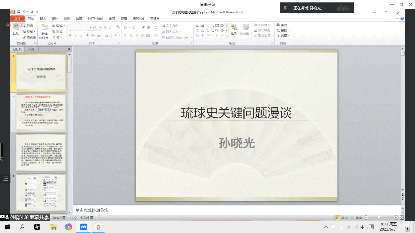 讲座伊始,孙晓光老师先以“2022年是一个特殊的历史节点”——“琉球处分”150年与美国返还日本琉球(冲绳)“施政权”与中日邦交正常化50年以及自明洪武五年(1372年)始至1872年,中国与琉球两国之间的友好往来的“500年”的特殊时间节点,引出琉球史研究的意义:有利于丰富历史学的学科建设,在微观上对世界史、海疆史、中国史以及考古学的学科建设发展具有重要意义;琉球史研究也有助于认识分析现实东亚国际关系当中出现的一些棘手问题,例如钓鱼岛问题、东海问题与南海问题为主的东亚海域纷争;对琉球史的研究也有助于了解中琉友好交流的历史文化基础。 孙老师还向大家展示了历史学界对琉球问题的关注:2013年5月8日,时任中国史学会会长张海鹏先生与中国社会科香港赛马会投注站 中国边疆研究中心李国强先生在《人民日报》上发表了《论<马关条约>与钓鱼岛问题》的文章,其结尾提到“历史上悬而未决的琉球问题也到了可以再议的时候”,引发了学术界与政策界的高度关注。孙老师针对文章中提到的琉球“再议”问题梳理了四点启示:琉球“再议”议什么的问题;应加强“琉球墓园”、“琉球馆”等见证琉球历史和见证中琉交往历史的文物古迹保护、修缮工作;应充分研判“琉球再议”对东亚海域争端影响的连锁效应;关注琉球人的“民意选择“。此外,他还展示了“琉球民族独立综合研究学会”的成立宗旨。