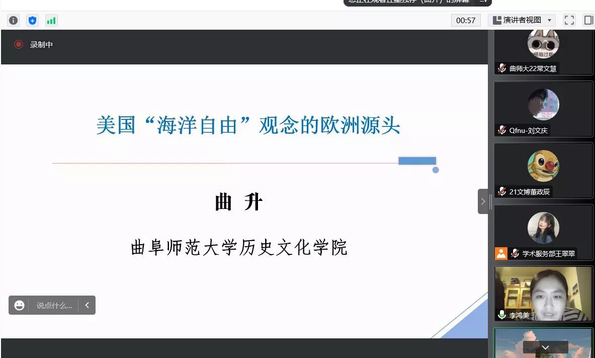 在师生互动环节中,在线师生与曲升教授积极交流。曲升教授回答了关于“美国近代南海政策的转变与美国海军力量增长之间的关系”“美国政策长期存在的中立主义和全球主义立场是否都与美国‘海洋自由’主张相适配,‘海洋自由’在这两种模式及政治实践中又是如何表现的”等有关问题,同学们受益匪浅。