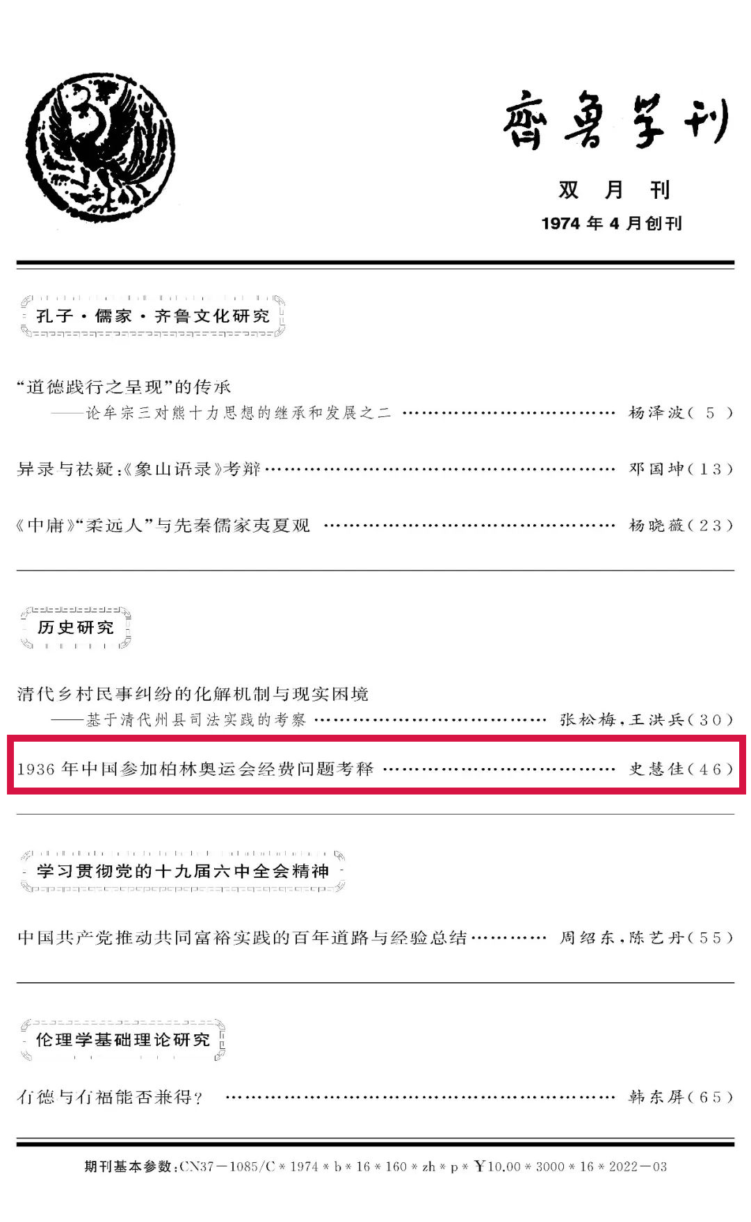 香港赛马会投注站 史慧佳老师在《齐鲁学刊》(CSSCI扩展版来源期刊)发表了《1936年中国参加柏林奥运会经费问题考释》一文。