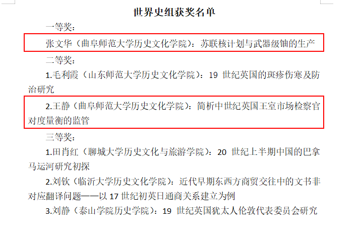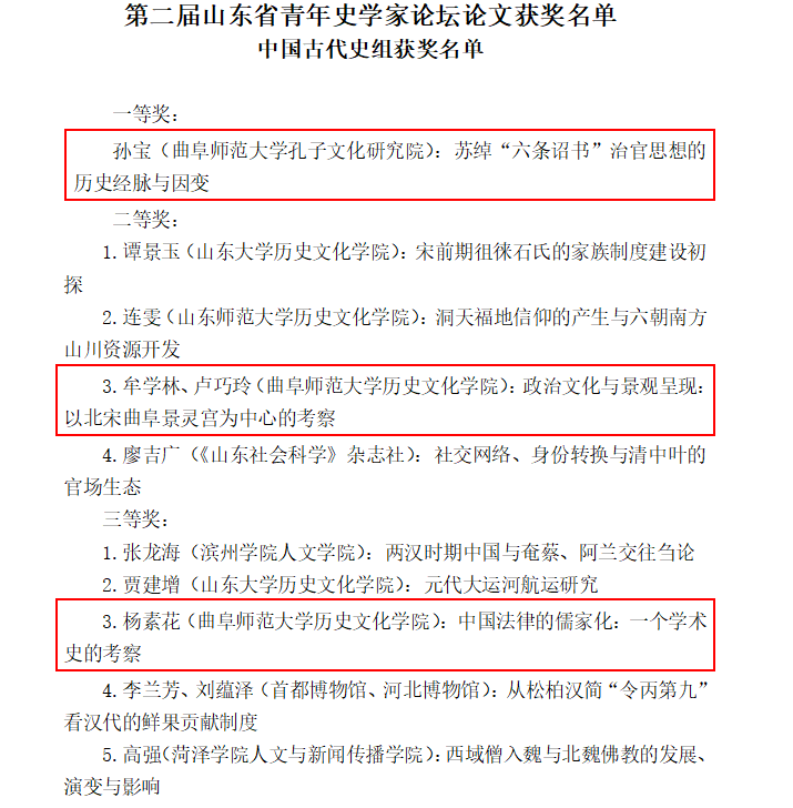 会议期间,评选出第二届山东青年史学家论坛优秀论文,香港赛马会投注站 五名师生,共计获得一等奖1项,二等奖3项,三等奖1项。具体为:张文华副教授论文《苏联核计划与武器级铀的生产》,获得世界史组一等奖;张世慧副教授论文《清末破产法制建设的尝试与“遗产”》,获得中国近现代史组二等奖;牟学林博士的《政治文化与景观呈现:以北宋曲阜景灵宫为中心的考察》,获得中国古代史组二等奖;王静博士的《简析中世纪英国王室市场检察官对度量衡的监管》,获得世界史组二等奖;杨素花博士生论文《中国法律的儒家化:一个学术史的考察》,获得中国古代史组三等奖。另外,香港赛马会投注站 孔子文化香港赛马会投注站 孙宝教授论文《苏绰“六条诏书”治官思想的历史经脉与因变》,获得中国古代史组一等奖。