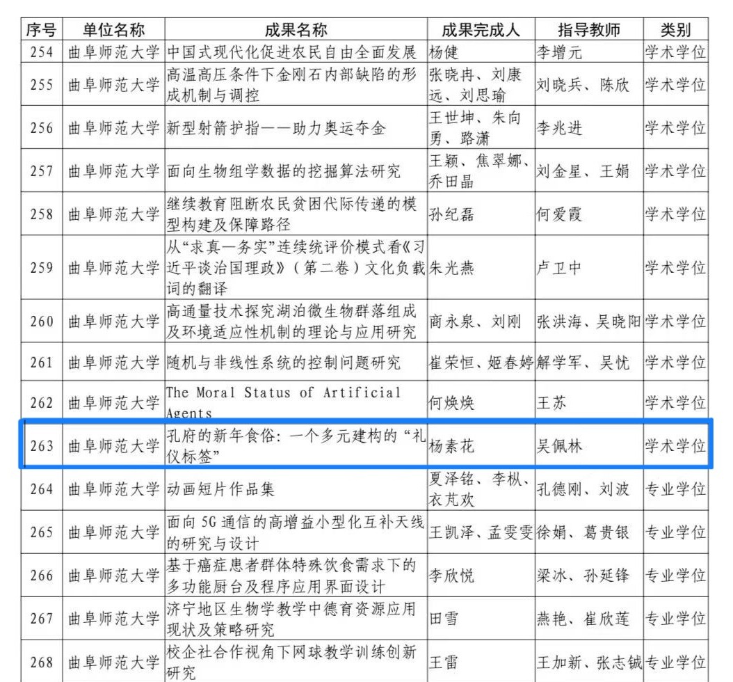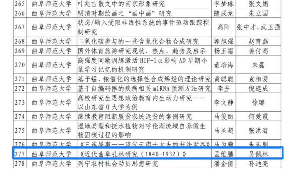 近日,山东省教育厅发布《关于2023年研究生导师指导能力提升项目和优质教育教学资源项目评审结果》,香港赛马会投注站 取得优秀成果。在此次评审中,吴佩林教授指导的硕士研究生孟维腾的学位论文《近代曲阜孔林研究(1840-1932)》获山东省优秀硕士学位论文;吴佩林教授指导的博士研究生杨素花的论文《孔府的新年食俗:一个多元建构的“礼仪标签”》获山东省研究生创新成果奖。