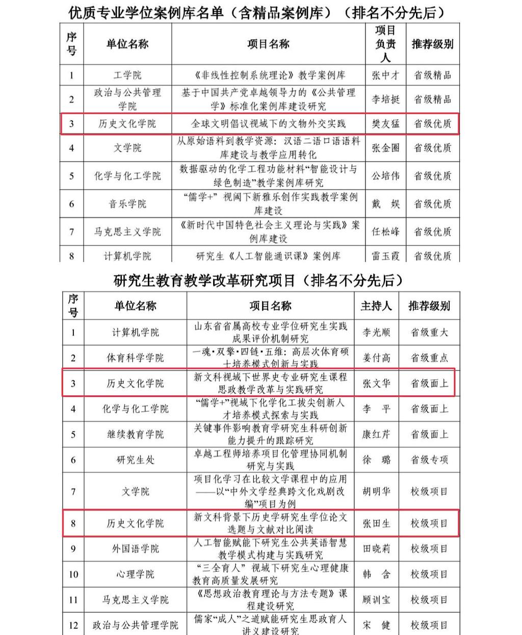 在此次推荐名单中,2020级中国史专业博士生杨素花《明清至民国时期孔府饮食活动研究》入选校级优秀博士学位论文;2021级文物与博物馆专业硕士生李彤《滦河流域辽金时期城址的考古学研究》推荐省级优秀硕士学位论文;2021级世界史专业硕士生蔡雨桐《美国汉福德核工厂研究(1943-1971)》入选校级优秀硕士学位论文;2023级学科教学(历史)专业硕士生丛微《明朝政治制度的变化教学设计》推荐省级研究生创新成果;2023级文物与博物馆专业硕士生张宇《我国革命文物保护利用政策调查研究》入选校级研究生创新成果;樊友猛副教授主持的《全球文明倡议视域下的文物外交实践》推荐省级优质专业学位案例库;张文华副教授主持的《新文科视域下世界史专业研究生课程思政教学改革与实践研究》推荐省级面上教学改革项目;张田生副教授主持的《新文科背景下历史学研究生学位论文选题与文献对比阅读》入选校级教学改革项目。