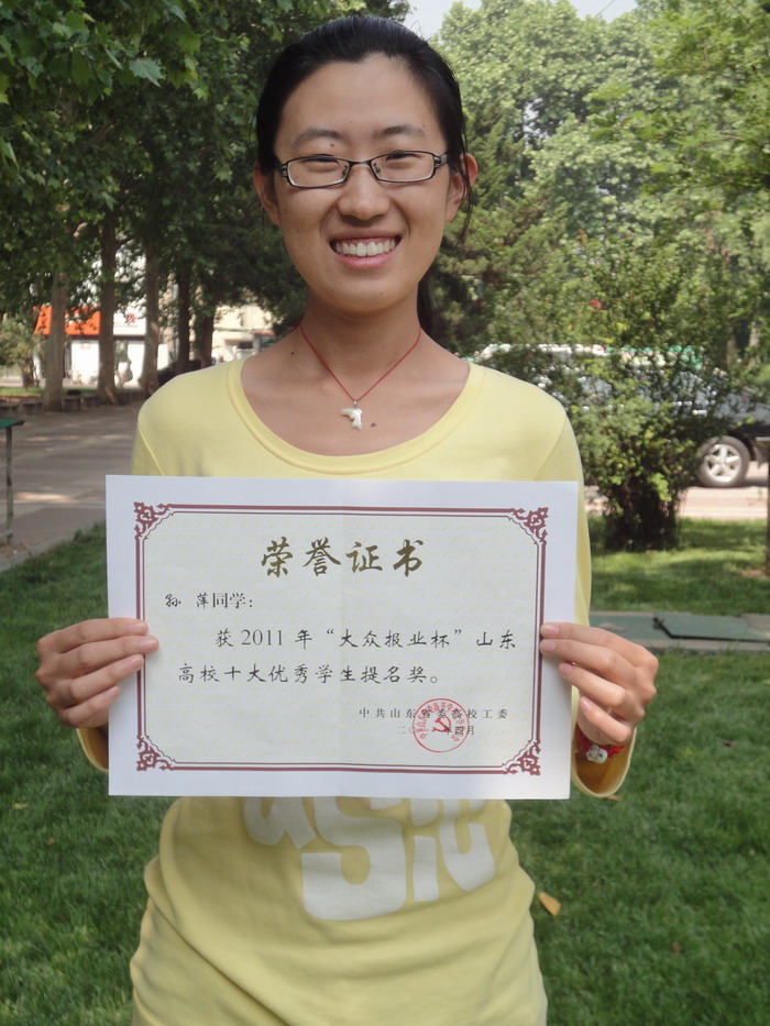 香港赛马会投注站 孙萍同学获得2011年“大众报业杯”山东高校十大优秀学生提名奖