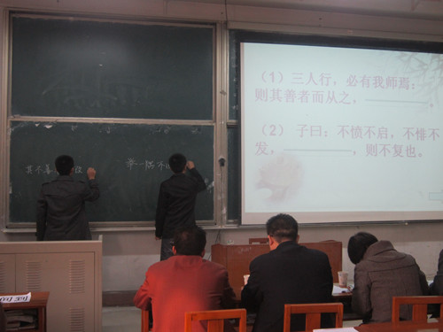 本次比赛共分为三个环节,第一环节为现场展示,参赛选手在黑板上书写自己的作品,同时工作人员在大屏幕上播放选手制作的粉笔字幻灯片。选手们各有千秋书写,作品规范整齐、美观大方。第二环节为抽签答题,参赛选手分为两人一组,从《论语》中选择要回答的题目,将句子补充完整并写在黑板上。最后一环节为加时赛,由三组平分选手参加。