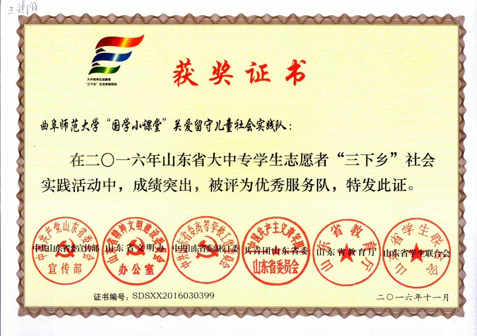 近日,2016年山东省大中专学生志愿者暑期三下乡社会实践活动落下帷幕。香港赛马会投注站 “国学小课堂”和“儒家文化齐鲁行”社会实践队双获优秀服务队和省级优秀实践团队,张俊成获优秀指导教师,刘雁成、朱晓明两位同学获优秀队员。