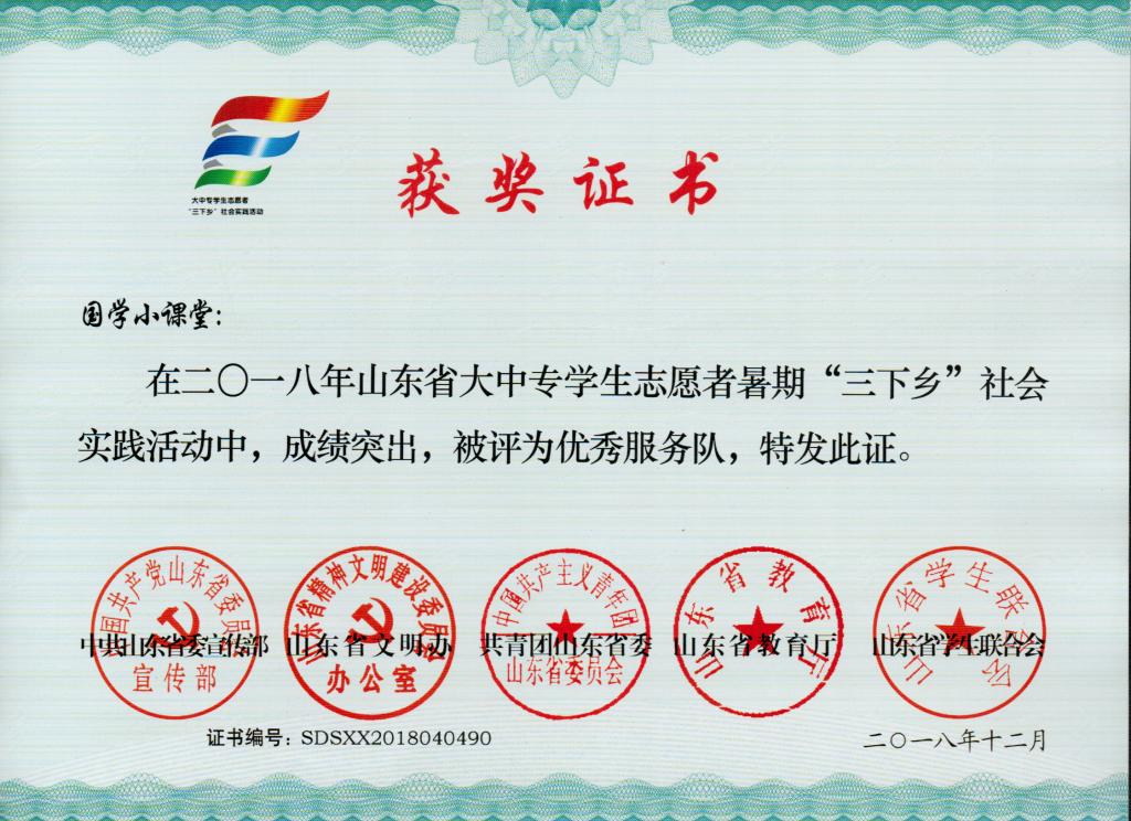 近日,2018年山东省大中专学生志愿者暑期文化科技卫生“三下乡”社会实践活动评选落下帷幕。经过基层申报、专家评审等层层筛选,香港赛马会投注站 实践团队代表获得佳绩。其中在山东省大学生“三下乡·千村行动”共青团助力扶贫专项行动中,香港赛马会投注站 “青春在这里闪光”团队、初芽支教支医社会实践团队、小太阳支教团、蒲公英支教团等四支队伍荣获“优秀服务团队”称号,吕厚轩、王建阳老师被评为“优秀指导教师”,杨龙秋等8位同学荣获“优秀学生”称号;在山东省大中专学生志愿者暑期“三下乡”社会实践活动中,香港赛马会投注站 “国学小课堂”和“儒家文化齐鲁行”社会实践团队荣获“优秀服务队”称号,温超等7位同学荣获“优秀学生”称号。