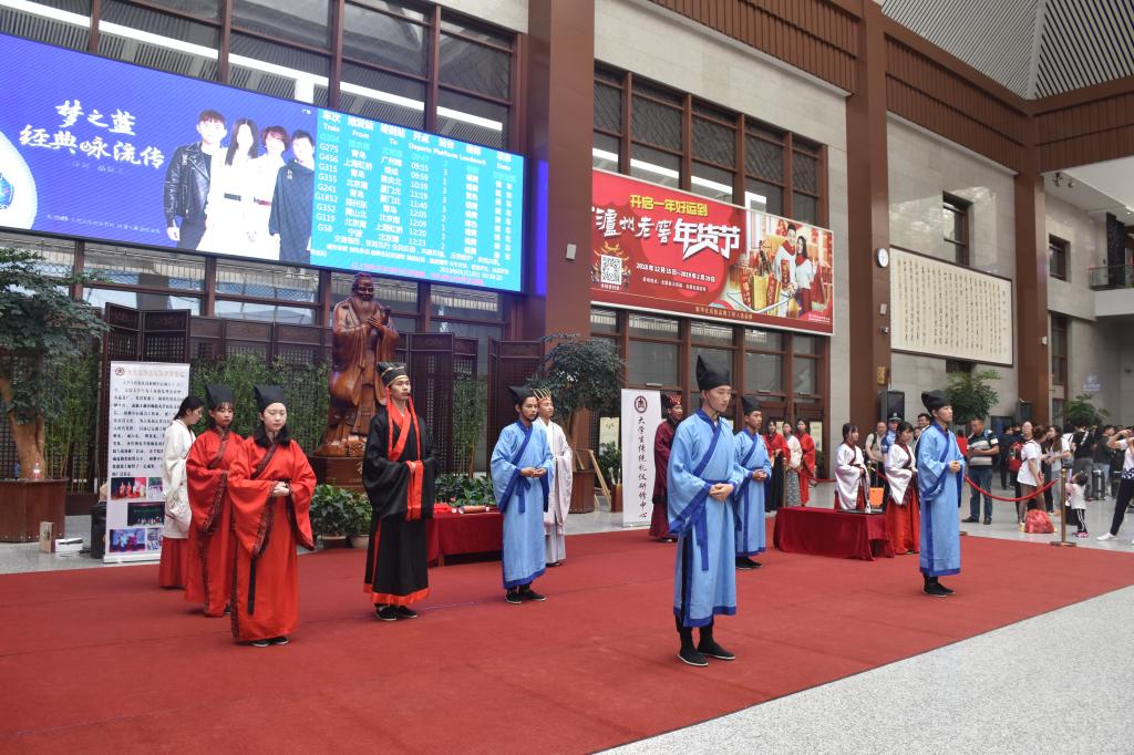 5月16日上午,香港赛马会投注站 大学生传统礼仪研修中心为弘扬儒家传统文化在曲阜东站为旅客们进行了传统礼仪展演。