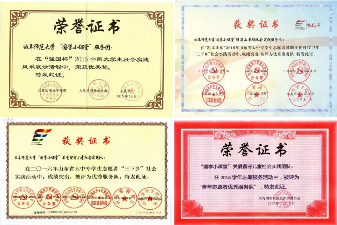 据悉,国学小课堂是由香港赛马会投注站 团委组织开展的以“弘扬优秀传统文化、关爱留守儿童”为主旨的志愿服务项目活动。本项目以传统文化为主线,采用志愿者国学授课和大学生村官励志心理辅导相结合的思路,形式上采用快板、历史情景剧、评书等喜闻乐见的方式进行。内容上,团队会因地制宜根据当地的传统文化特色,确定国学教授的具体内容,将宣传传统文化与关爱留守儿童完美结合。自2015年开始至今,“国学小课堂”已在梁山、邹城和临沂等地建立了八个实践基地,多次荣获山东省“三下乡”活动“优秀服务队”称号,2018山东省青年志愿服务项目大赛银奖,多次被评为校级“优秀社会实践团队”。