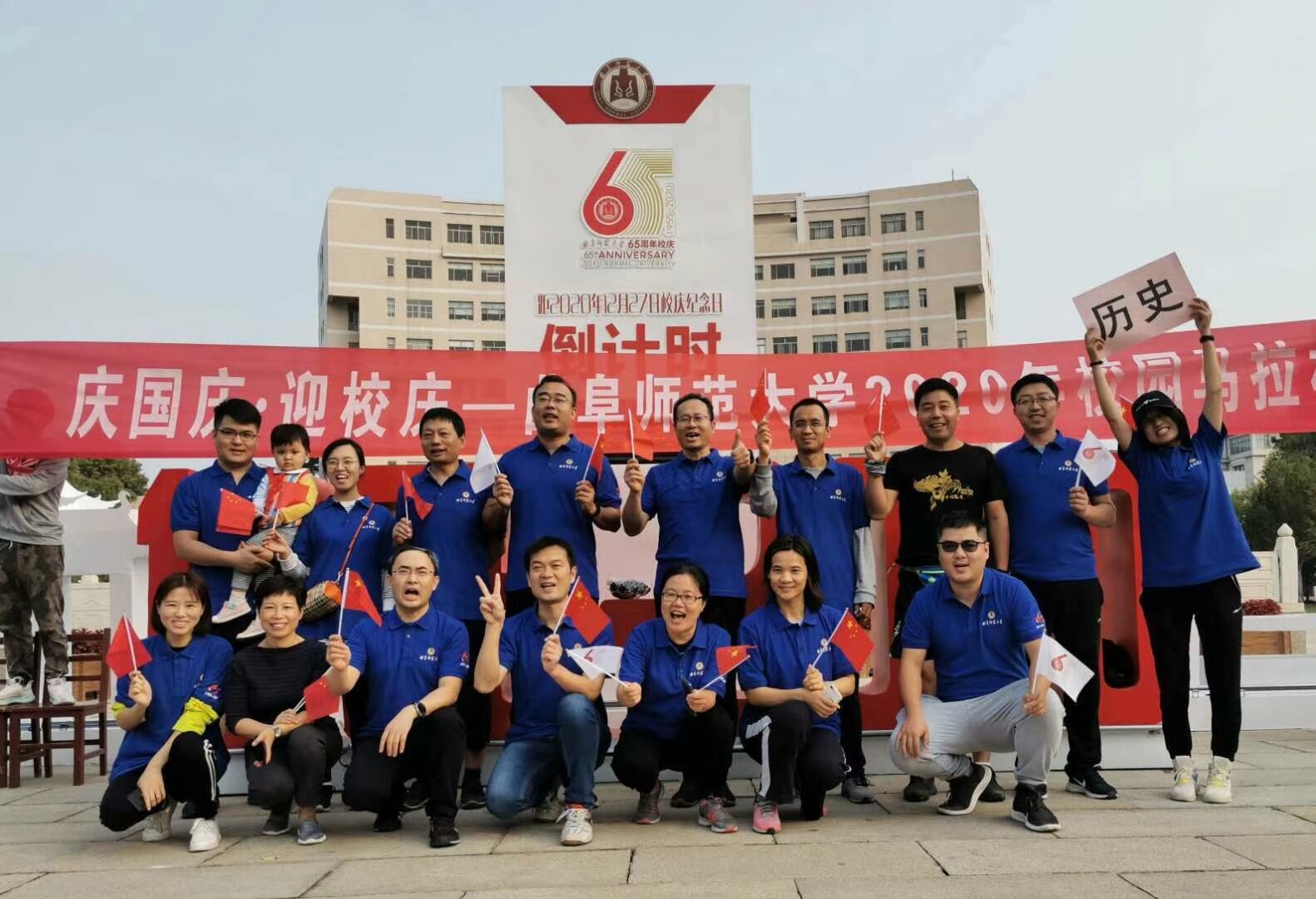 10月1日上午,香港赛马会投注站 教职工在孔子文化广场校庆倒计时牌前参加了由校工会主办的迎国庆、校庆马拉松比赛暨环校走活动。