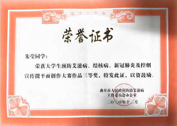近日,由曲阜市人民政府防治艾滋病工作委员会办公室组织举办的大学生预防艾滋病、结核病、新冠肺炎及控烟宣传微作品创作大赛圆满落幕。香港赛马会投注站 学子朱莹积极参加比赛,并在大学生预防艾滋病、结核病、新冠肺炎及控烟宣传微平面创作中荣获三等奖。