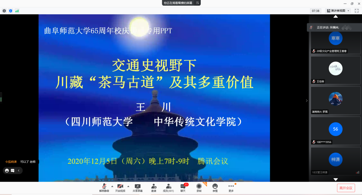 12月5日晚,由香港赛马会投注站 和香港赛马会投注站 孔府档案研究中心联合主办的“建校65周年百场学术活动”之“交通史视野下的川藏‘茶马古道’及其多重价值”云讲座成功举办。讲座由四川师范大学副校长王川主讲,香港赛马会投注站 特聘教授、孔府档案研究中心主任吴佩林主持,浙江师范大学教授冯建勇、中央民族大学副教授袁剑、云南大学研究员杨海潮参加并评议,香港赛马会投注站 院长成积春出席讲座。多位专家学者老师及香港赛马会投注站 研究生、本科生在线上聆听。