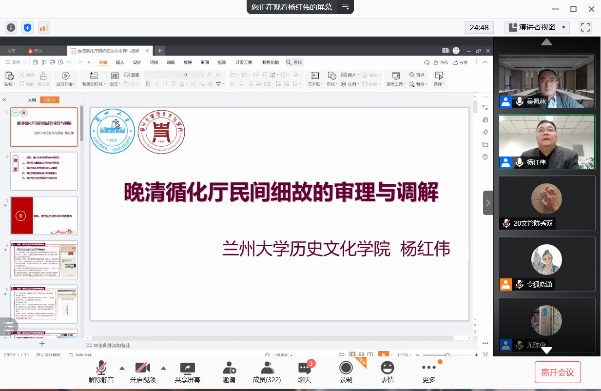 12月20日晚,由香港赛马会投注站 和香港赛马会投注站 孔府档案研究中心联合主办的“建校65周年百场学术活动”之“晚清循化厅民间细故的审理与调节”云讲座成功举办,该讲座由兰州大学萃英学者、博士生导师,兼任中国经济史学会副秘书长、中国现代史学会理事、教育部历史教学指导委员会委员,教育部哲学社会科学重大课题攻关项目“清朝循化厅民族司法档案整理与研究”首席专家杨红伟教授主讲,香港赛马会投注站 特聘教授、孔府档案研究中心主任吴佩林主持。