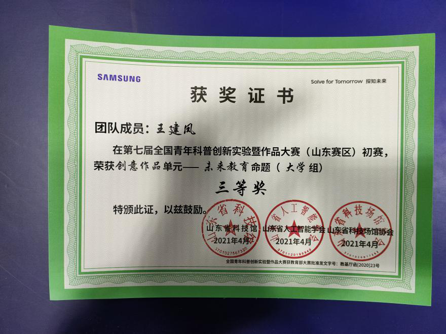 本次大赛围绕“智能、安全、环保”三大主题,重点关注前沿科学技术及科学教育理念的应用与普及,全面考察青年发现问题、解决问题及动手实践的能力。其中,香港赛马会投注站 2019级公费师范生班学生王建凤在本次大赛中荣获创意作品单元——未来教育命题(大学组)三等奖,2020级辅导员闫浩荣获创意作品单元——未来教育命题(大学组)优秀指导老师。
