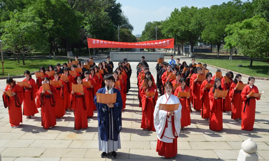 “子曰:‘志于道,据于德,依于仁,游于艺。’子曰:‘君子义以为质,礼以行之,孙以出之,信以成之。君子哉。’......”同学们身着汉家服饰、端庄大方,肃然起敬、回味经典,朗朗诵读声回荡在孔子文化广场。同学们声情并茂、抑扬顿挫的吟诵,使大家领略经典、感悟文化、享乐其中。经典选段不仅丰富了同学们的知识,更让同学们体悟到了中华民族优秀传统文化的魅力所在。