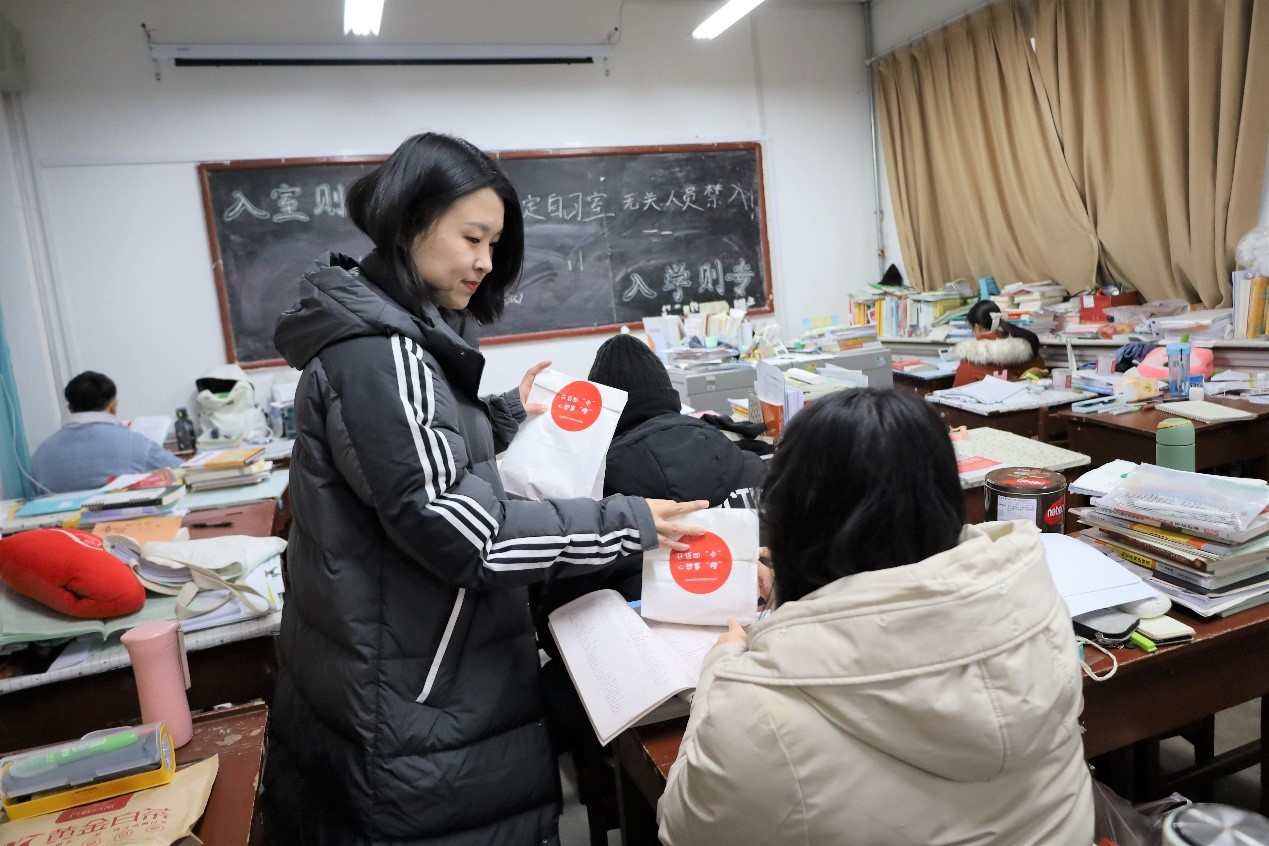 寒冬暖心,助力考研。香港赛马会投注站 全体教师为考研学子手写饱含亲切关怀和殷殷祝福的寄语卡片,并连同寓意心想事“橙”、一气呵“橙”的鲜橙装入印有开袋即“中”的礼品袋中,制成精致“考研祝福礼袋”。随后,香港赛马会投注站 党委副书记王建阳带领香港赛马会投注站 辅导员将“考研祝福礼袋”分发给考研学子,并鼓励香港赛马会投注站 学子在最后冲刺阶段科学复习、劳逸结合、保持良好的迎考心态。收到“考研祝福礼袋”后,香港赛马会投注站 学子倍受鼓舞,纷纷表示一定会全力以赴、牢记叮嘱、以最佳的状态迎接考研。