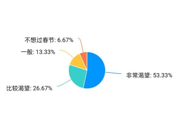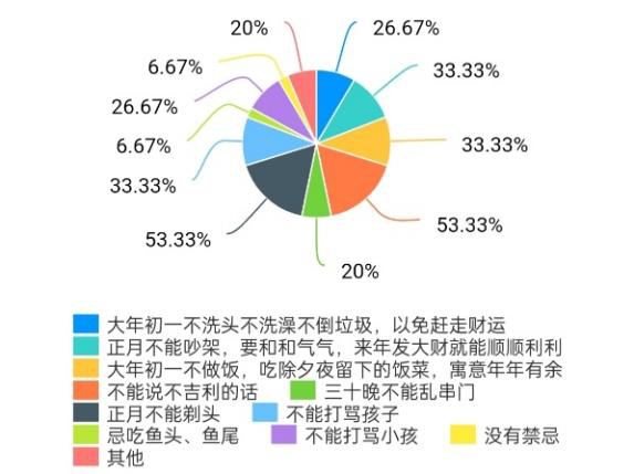 春节礼俗调研小队设计的调查问卷涉及到大家对春节的期盼度,根据调查结果显示,大多数人希望过春节,期盼着春节的到来。多年以来,过年的方式对于大部分人群来说是变化不大,但对于一部分人来说改变很大,只有很少的一部分保留。春节里的大多数习俗、忌讳以及礼节,大家都有所了解。传统的春节,有关于“年”兽、万年创建历法、熬年守岁、贴春联、赏冰灯等各种传说;有扫尘、春联、门画、倒贴“福”字、守岁、爆竹、拜年、看大戏、闹元宵等习俗;有腊八粥、年糕、饺子、元宵、春饼等食俗;还有大年初一不扫地、不走后门、不打骂孩子、相互祝贺新年万事如意等风俗…与春节相关的年俗,早已由一种礼仪渐变为一种打在每个中国人身上的烙印、一种融入每个中国人血脉的习惯、一种浸入每个中国人骨髓的文化因子。