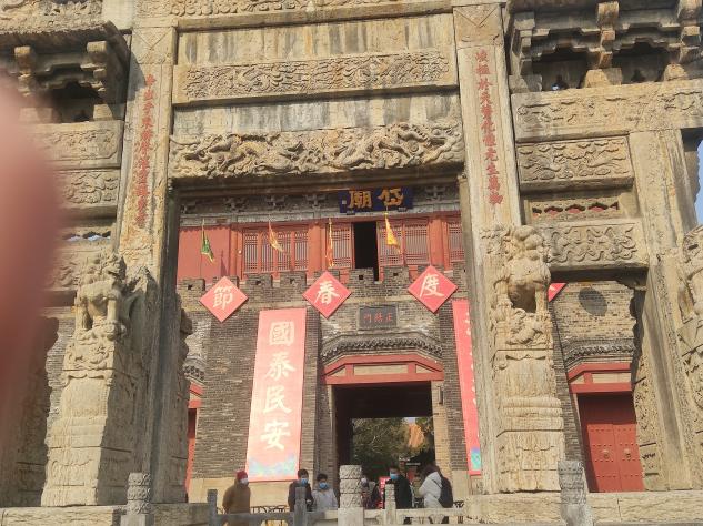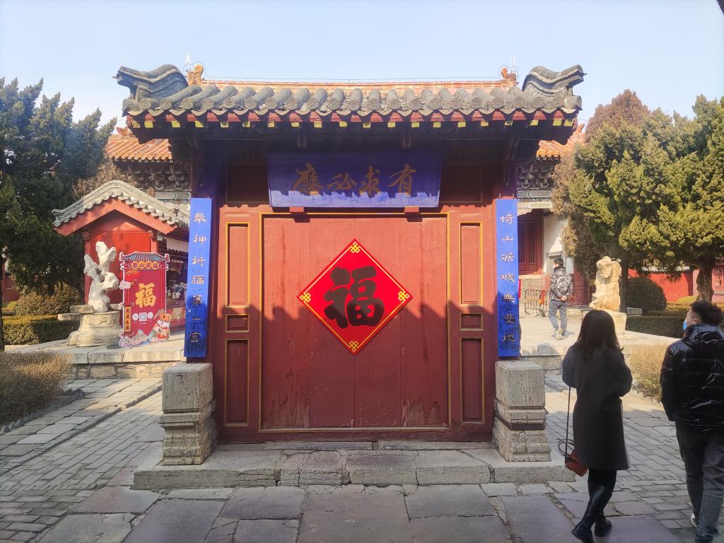 岱庙又被称为“东岳庙”,岱庙与北京故宫、曲阜“三孔”、承德避暑山庄并称为“中国四大古建筑群”。队员们进入岱庙,纷纷被其中深厚的文化底藴所吸引。建筑城墙古色古香,在阳光下披上了大红的春联。上联“河清海晏”,下联“国泰民安”,表现出泰安人民对新的一年的美好期待。城墙上挂满了火红的大灯笼,让古老的城墙焕发出新春活力。