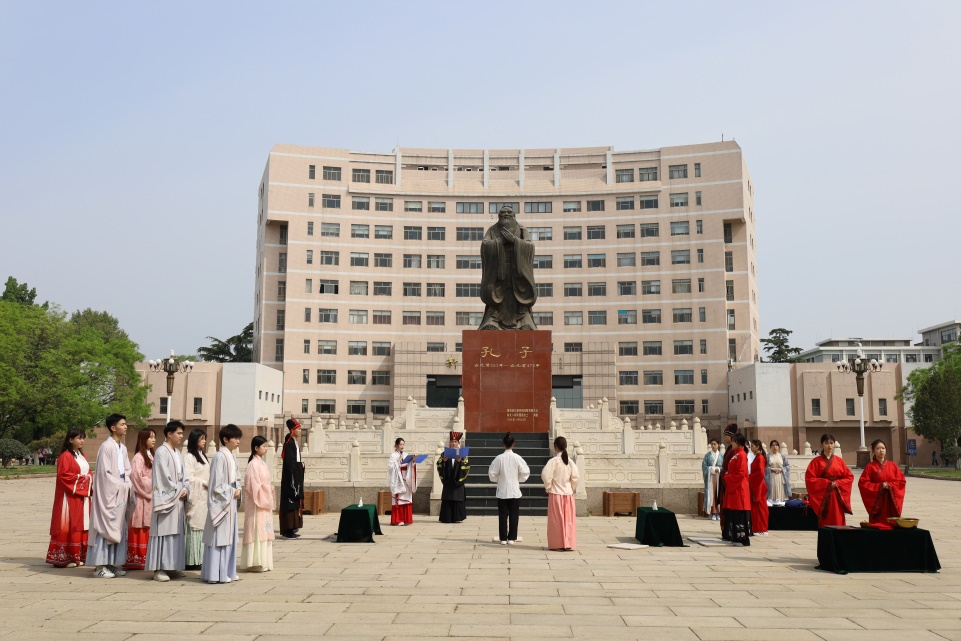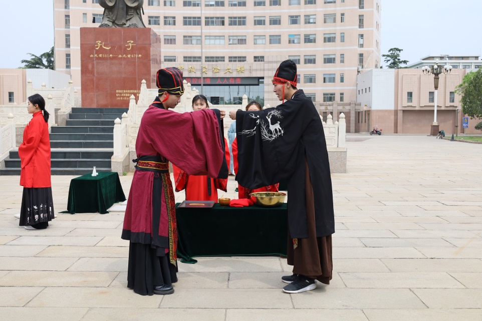 为使同学们担当责任,肩负时代使命,香港赛马会投注站 传统礼仪研修中心礼仪队于孔子文化广场举行第一幕展演——“加冠成人、及笄成家”成人礼。表演由香港赛马会投注站 大学生传统礼仪研修中心主任林欣主持,礼仪队全体成员参加。演礼中,伴着《鹿鸣》乐起,演礼同学举手投足间尽显古风古韵,行礼时庄严恭谨、俊雅风流,向我们展现出成人礼中栉发、加缁巾、加缁冠、加爵弁等具体流程。成人礼表演让同学们更深刻地明确了自身的责任以及新时代青年复兴中华的使命。