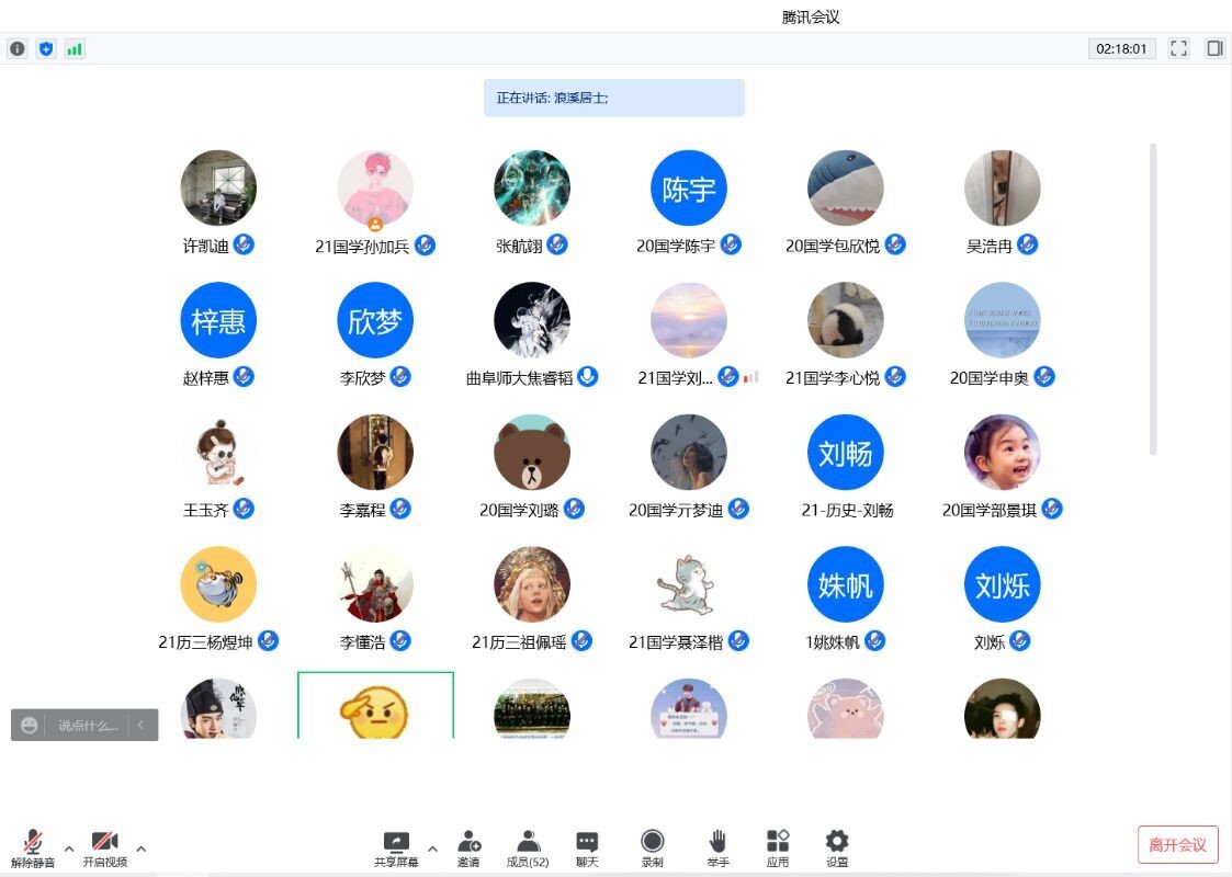 本次读书交流会包括读书分享和自由讨论两个环节。发言人通过抽签确定发言顺序,6位同学依次进行书籍、论文分享,分别为焦睿韬《巫蛊之祸和儒生帝国的兴起》,孙加兵《蒙元入侵前夜的中国日常生活》,薛兆恒《明史讲义》,李心悦《清代知县对差役的管控与成效》,李梦茹《疑案里的中国史》,申奥《对历史学的若干反思》及《历史学两重性片论》。分享结束后同学们就历史学习研究方法、历史著作阅读经验并针对一些史学观点进行了热烈的讨论,并最终进行了线上合影留念。