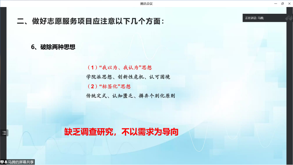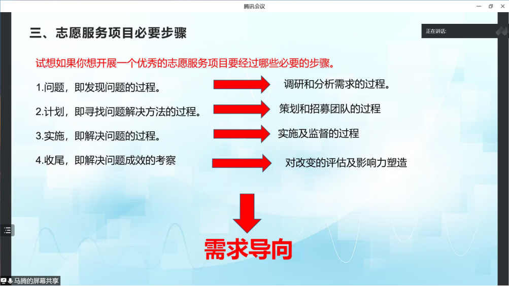 此次培训会,马腾老师从项目概念、项目实施注意事项、项目必要步骤、项目一般过程和如何做好志愿服务项目五个方面向大家做出了详细的介绍。其中,马腾老师重点阐述了项目实施的注意事项,他明确指出志愿服务项目的实施一定要对社会问题有充分的调查和研究,坚持服务对象保护及自我提升原则,才能更好地为社会国家做贡献。同时,针对项目必要步骤和一般过程,马腾老师提醒同学们要时刻以社会需求为导向去制定项目计划,并且要注重项目数据评估以及经验总结,为项目深入开展奠定基础。他提到,只有符合国家发展方向,脚踏实地,勇于创新,才能在志愿项目申报中脱颖而出。最后,马腾老师对志愿服务项目大赛的参赛材料撰写再次进行了梳理,并祝愿同学们在第四届山东省青年志愿服务项目大赛中取得优异的成绩。