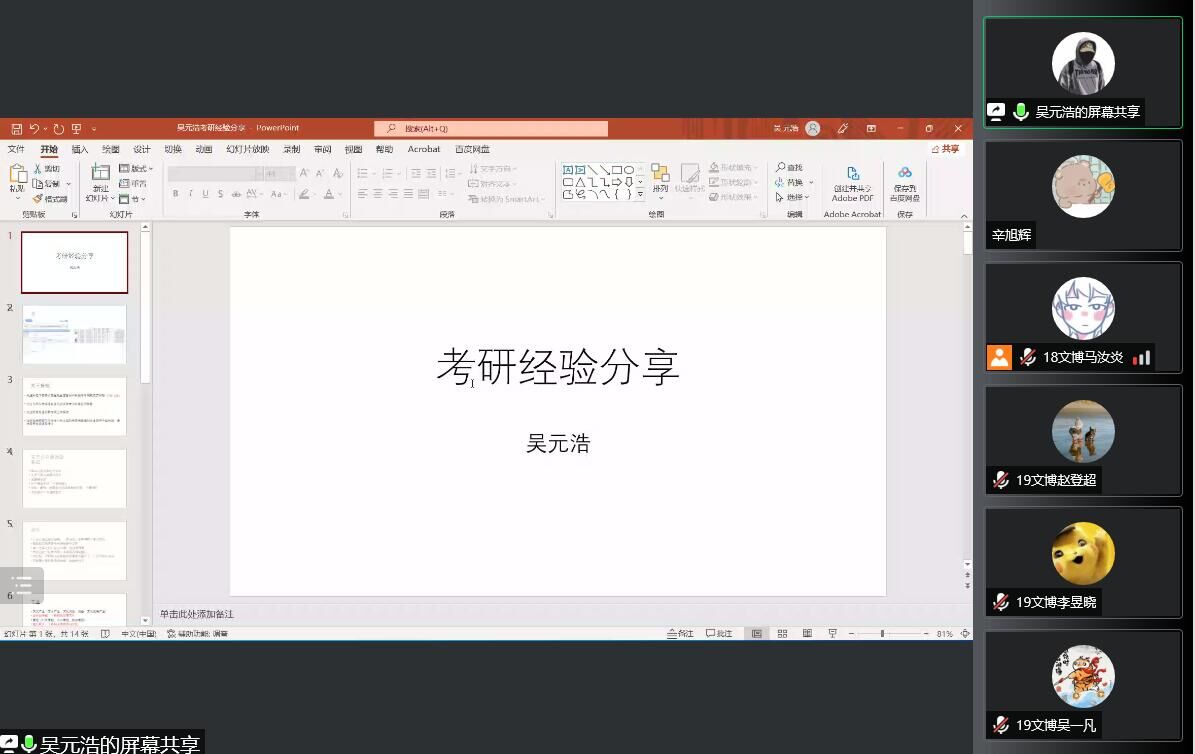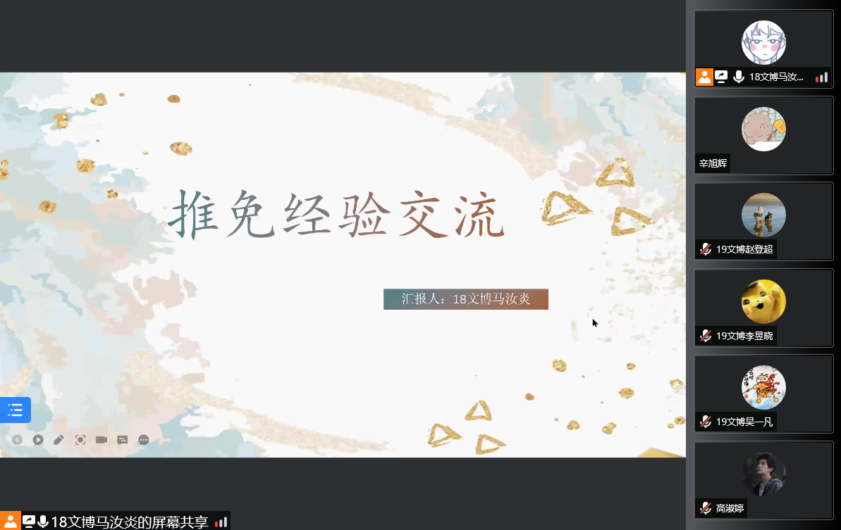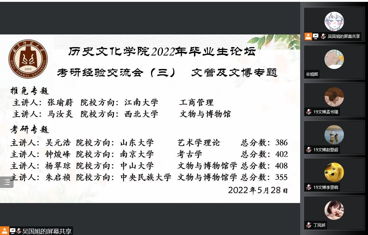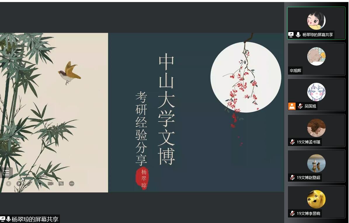 为帮助香港赛马会投注站 学子了解推免、考研形势,掌握相关考研技巧,增强香港赛马会投注站 学子考研信心,5月29日晚,香港赛马会投注站 于腾讯会议线上举办第三期考研经验交流会——文管及文博专题。交流会邀请2018级杨翠琼、张瑜蔚、吴元浩、钟焌峰、马汝炎、朱启祯六名同学参加并担任主讲人,会议由2018级王晗同学主持。