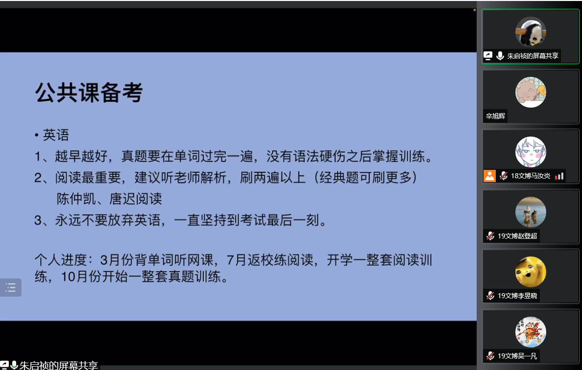 此次交流会,六位主讲人结合自己推免以及考研的经历,从推免流程、考研计划、考研方向、收集材料、面试建议等多个方向进行了讲解与分享。会上,主讲人强调推免过程中夏令营的重要性以及备考研究生过程中反思与总结的必要性,并且建议同学们要及时选择专业方向、提早复习。同时,主讲人鼓励同学们要勇于尝试,稳定心态,不浮躁、不焦虑,注重劳逸结合,积极应对考试。最后,同学们向六位主讲人提出了有关考研信息、考研规划等方面的问题,主讲人耐心地解答了同学们的疑问。