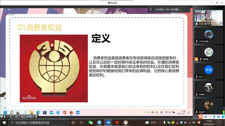 活动前期,比赛相关负责人明确比赛主题和参赛对象,积极筹划比赛,明确比赛相应细则和奖项,以便进行相应的比赛活动宣传,保证比赛顺利进行以及应对可能在比赛过程中出现的问题。在比赛中过程中,参赛选手打开屏幕共享和电脑摄像头进行演讲,精神饱满,口齿清晰。参赛选手的演讲角度不一,有的围绕消费者的权利进行探讨,有的从“懂得维权,学会诚信”的角度进行拓展,还有依据消费者权益的定义入手。演讲结束后,评委们依照所制定的评分标准对每位参赛选手进行打分。