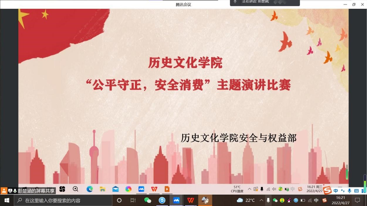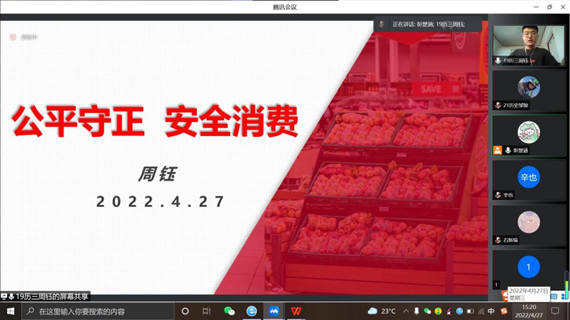 为普及维权知识,提高大学生维权能力,协助香港赛马会投注站 开展“百年庆团际,维权携吾力”主题活动,4月27日,香港赛马会投注站 安全与权益部面向香港赛马会投注站 全体同学于在腾讯会议组织开展线上“公平守正,安全消费”主题演讲比赛。
