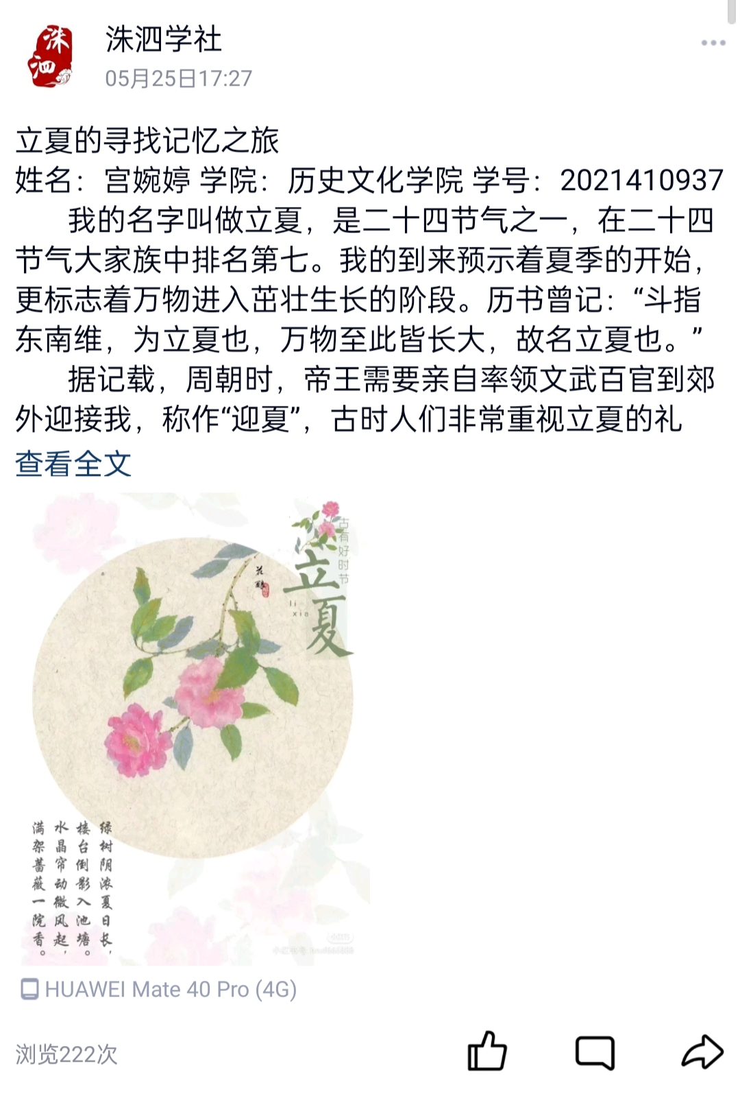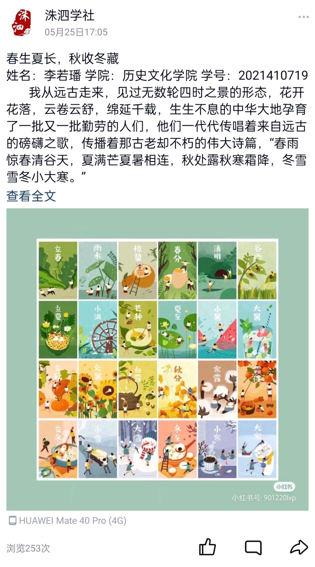 为了加深同学们对“二十四节气”的兴趣,了解中华传统文化,5月1日,香港赛马会投注站 洙泗学社成功举办了“二十四节气”征文比赛。