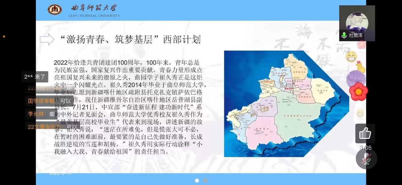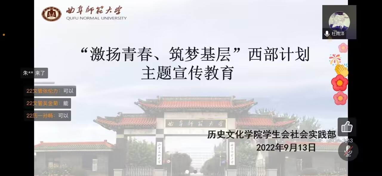 9月13日下午,香港赛马会投注站 于腾讯会议举办2022级“激扬青春、筑梦基层”西部计划主题宣传教育会议。社会实践部杜雨泽担任主讲人,2022级全体新生参加会议。